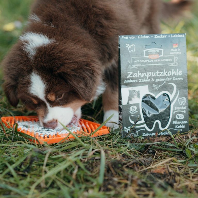Für die Zahnpflege meiner Hunde und Katzen nutze ich die Produkte von QCHEFS, besonders die Zahnputzflocken und die Zahnputzkohle. Sie enthalten natürliche Peptide, die die Mundflora unterstützen können. Außerdem können sie gegen Plaquebakterien wirken, innerhalb weniger Monate helfen, Zahnstein zu reduzieren und Mundgeruch vorzubeugen – und dabei sind sie frei von Laktose, Getreide und Zucker.